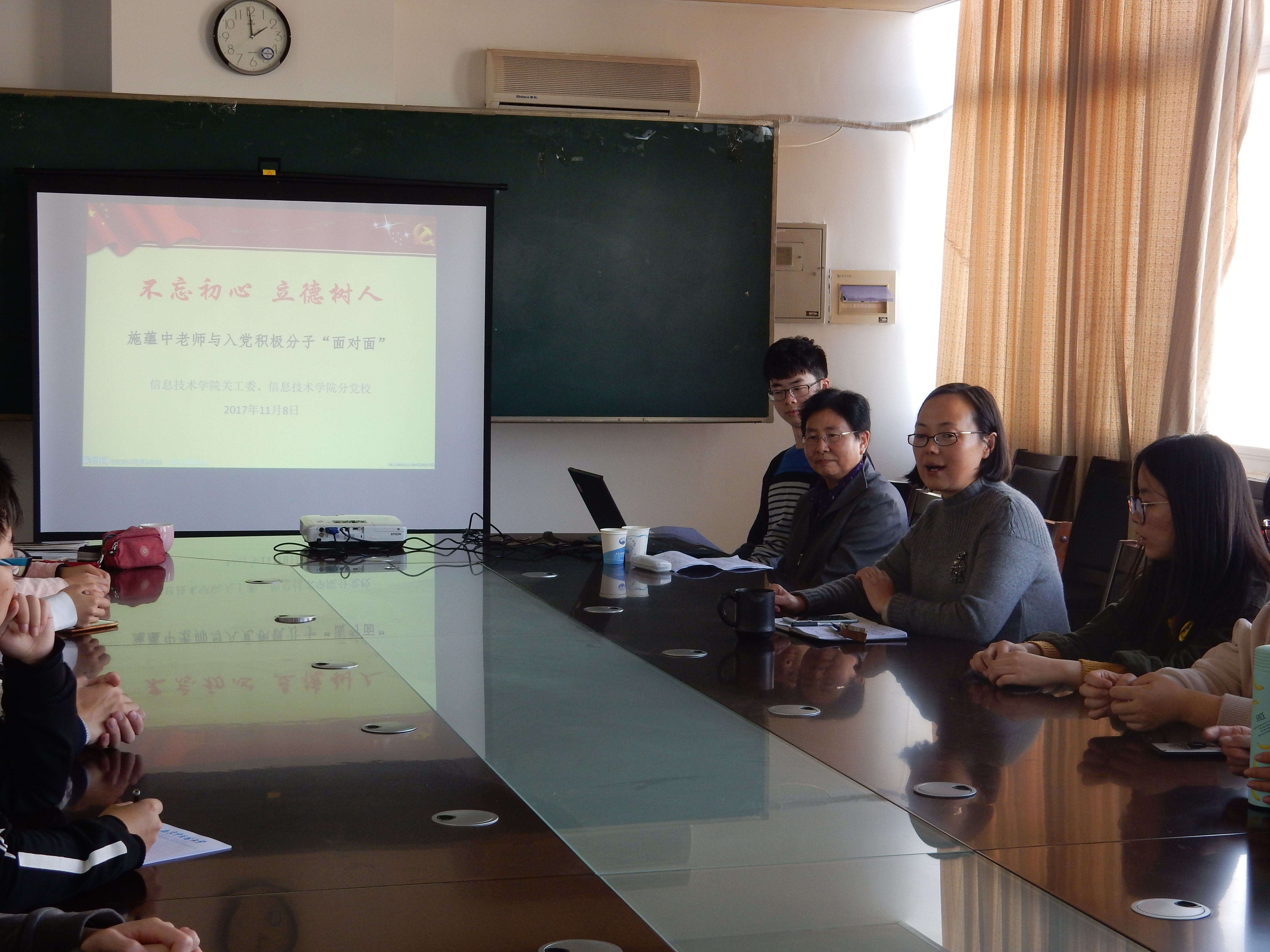 11月8日下午2点,信息技术学院关工委邀请了外国语学院退休教师施蕴中老师,与信息、外国语两院本期分党校学员展开座谈。施老师为此悉心准备多日,多次沟通,精心制作展示课件,认真严谨的态度令参会师生肃然起敬。座谈会由信息技术学院入党积极分子代表胡天乐同学主持,蔡爱华书记出席。蔡书记向同学们简单介绍了施蕴中老师,并强调了本次活动的目的意义。