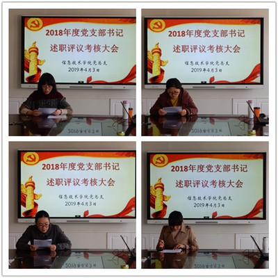 4月3日中午1:00,学院党总支在会议室召开2018年度党支部书记履行党建工作责任的述职评议大会,会议由蔡爱华书记主持,全体党总支委员、各党支部书记参会。