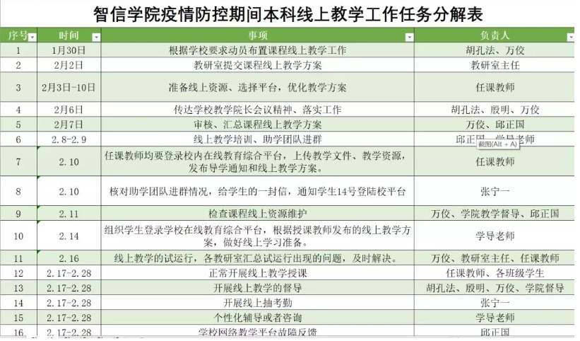 2、分解任务,职责明确。为保证线上教学工作有条不紊的开展,学院面向教师层面,制定了《疫情防控期间本科线上教学工作任务分解表》,明确了线上教学工作的各项任务、时间点和责任人;召开在线教学协调推进视频会议,听取各教研室工作进度汇报,院级层面整合资源,解决矛盾。面向学生,则由学工办牵头,发起了《给新葡萄8883官网AMG全体本科生的一封信》,一方面明确了线上开课及开学初常规教学工作的安排,帮助同学们尽快适应“新课堂”,另一方面嘱咐同学们牢记新时代青年的责任与担当,积极做好疫情防护的同时也要明辨是非!鼓励大家彰显南中医智信人的本色,合力打赢这场疫情阻击战!