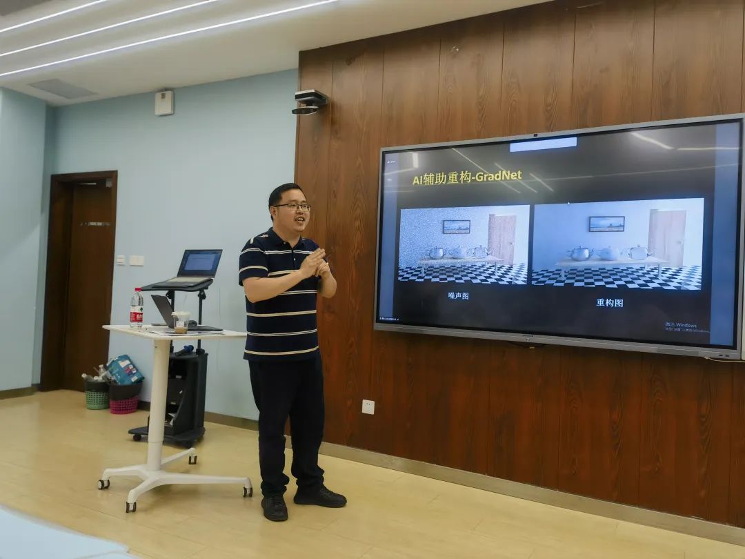 周作建代表学院对过洁的来访表示热烈欢迎,希望以此为契机,加强与过洁课题团队等高水平团队的合作交流,积极探讨中医药人工智能技术和应用。过洁分享了在AI辅助高性能真实感图形渲染方向的研究工作,探索以路径导引、智能帧外插、高效探针为代表的下一代AI辅助高性能渲染基础框架的发展方向。他围绕计算机图形领域渲染引擎“卡脖子”关键技术领域,重点介绍了其团队围绕国产化自主可控图形渲染引擎Moer相关研发工作。团队成果已应用到教育、国防、文物保护等相关领域,提高了大规模三维场景渲染的性能,可为未来虚拟现实、元宇宙等新型数字经济产业的持续发展提供强有力技术保障。