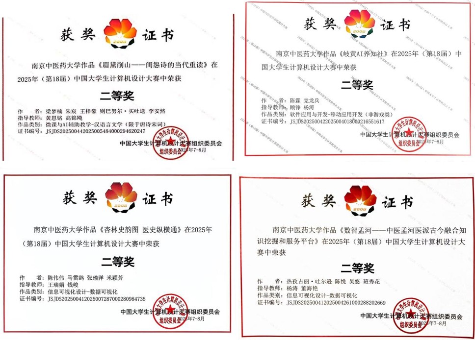 2025年7至8月,第18届中国大学生计算机设计大赛国赛分时段在全国5个赛区举行,我校荣获4个二等奖和4个三等奖。